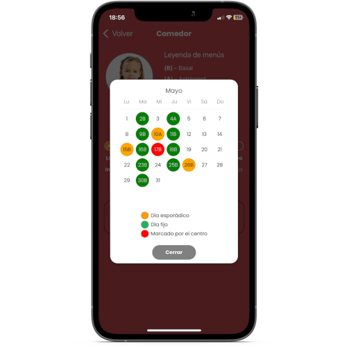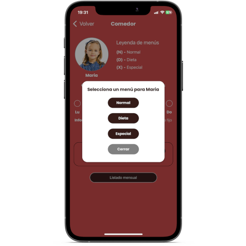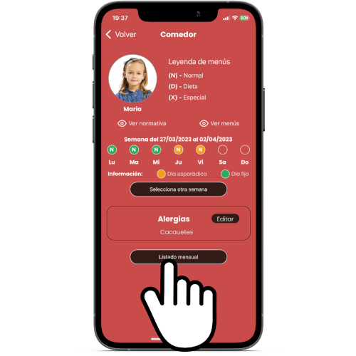 Si quieres comprobar qué días ha asistido tu hijo o hija al comedor o qué días lo has inscrito, puedes hacerlo haciendo clic en el botón “Listado mensual”